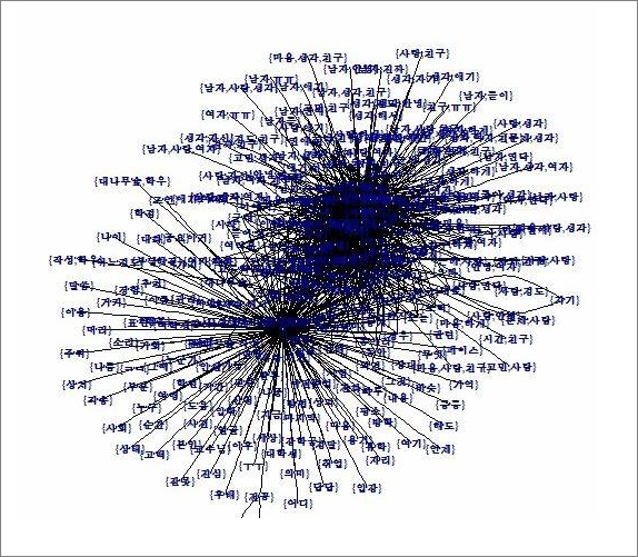 또한 단어들 중에서, 하나의 게시물에 같이 나오는 단어끼리 짝지은 결과 다수의 연애 글과 소수의 기타 글로 나뉘는 모습을 볼 수 있다.
