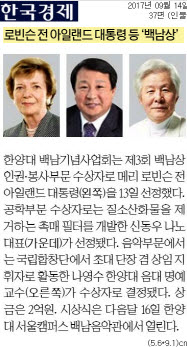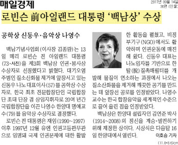 9월 14일 <조선일보> 외 5개 매체에서는 한양대 백남기념사업회가 주최한 제 3회 백남상 인권, 봉사 부문 수상자로 '메리 로빈슨' 전 아일랜드 대통령이 선정되었다고 전했습니다. 이외에도 공학 부문 수상자로는 질소산화물을 제거하는 촉매 필터를 개발한 신동우 나노대표가 선정됐으며, 음악부문에서는 국립합창단에서 초대 단장 겸 상임 지휘자로 활동한 나영수 한양대 음대 명예교수가 수상자로 결정됐습니다. 상금은 2억원이며, 시상식은 다음달 16일 한양대 서울캠퍼스 백남음악관에서 열립니다.