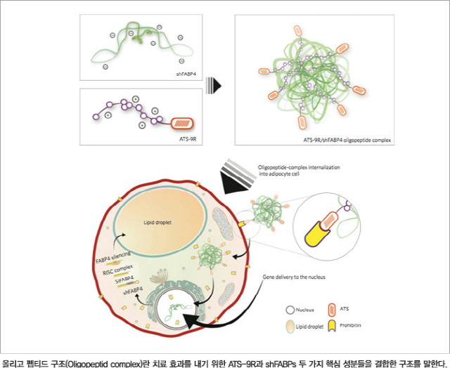 김용희 교수는 이러한 지방세포를 추적해 분해하고 억제하는 시스템을 만들었다. 약물전달 시스템 ATS-9R(Adipocyte Targeting Sequence Arginine)과 지방 억제 치료제 FABP-4 shRNA(Fatty Acid-Binding Protein-4 Short Hairpin RNA, 이하 shFABPs)의 결합으로 이루어진 올리고펩티드(Oligopeptid complex) 구조가 그것이다. 올리고펩티드 구조란 치료 효과를 내기 위한 ATS-9R과 shFABPs 두 가지 핵심 성분들을 결합한 구조를 말한다. ATS-9R는 지방 세포를 추적하고 해당 세포에 투과성을 높여 유전자 전달 능력을 향상 시킨다. shFABPs는 치료제로서 지방세포 속으로 지질 수송 및 저장을 담당하는 단백질(A-FABP) 생성을 억제한다. 이 구성체를 정맥에 투여하면 ATS-9R의 도움으로 지방세포 핵으로 shFABPs치료제가 이동한다. 세포 핵으로 이동한 shFABPs는 세포 응답성을 하향 조절하는 siRNA를 만들어 비만 유전자 발현을 억제한다. 이런 일련의 과정을 통해 지방 축적을 억제하고 예방하는 것이다.