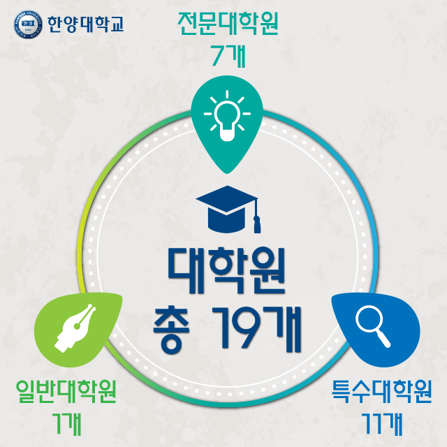한양대에는 서울캠퍼스와 ERICA캠퍼스로 구성되어 있으며 단과대학 수는 서울캠퍼스 15개, ERICA캠퍼스 8개로 총 23개 단과대가 있습니다. 아울러 대학원은 일반대학원 1개, 전문대학원 7개, 특수대학원 11개로 총 19개가 됩니다.