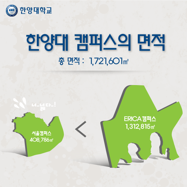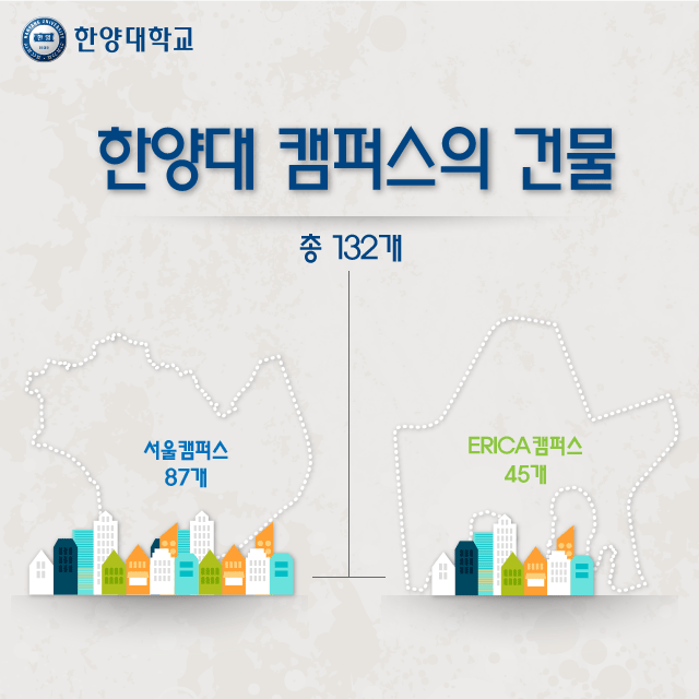 한양대 캠퍼스의 면적을 살펴보면 서울캠퍼스 408786 ㎡, ERICA캠퍼스 1312815㎡로 합산시 1721601㎡가 됩니다. 아울러 서울캠퍼스에는 87개, ERICA캠퍼스에는 45개의 건물이 있어 총 132개의 건물이 있습니다.