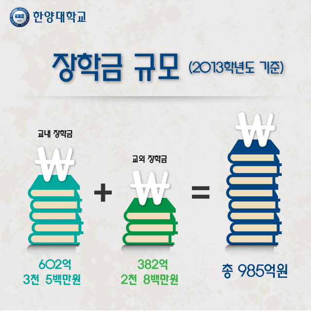 장학금 규모는 2013학년도 기준으로 교내 장학금이 602억 3천 5백만원, 교외 장학금이 382억 2천 8백만원으로 합산시 985억원여가 됩니다.