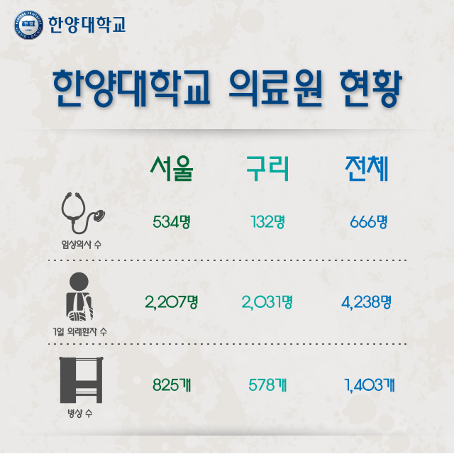 의료원의 경우 서울과 구리에 각각 운영되고 있으며, 임상의사수는 666명(서울 534명, 구리 132명), 1일 외래환자수는 4238명(서울 2207명, 구리 2031명), 병상 수는 1403개(서울 825개, 구리 578개)로 파악되었습니다.