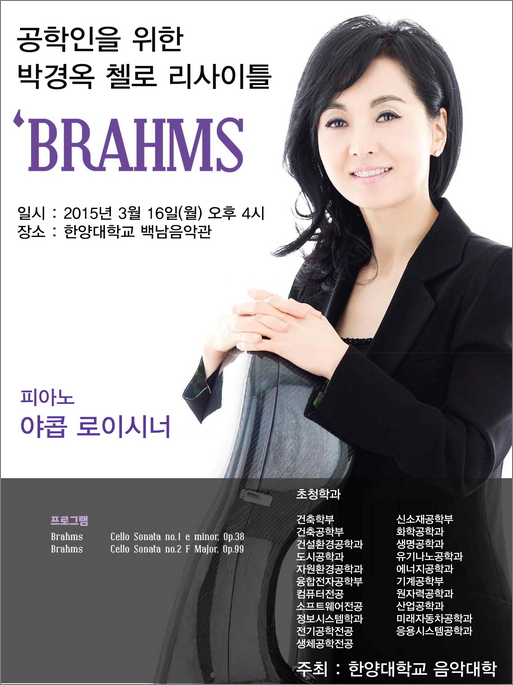 본 연주회에는 박 교수를 비롯해 독일 데트몰트 국립음대에 교수로 재직 중인 야콥 로이시너가 출연한다. 연주할 프로그램으로는 Brahms Cello Sonata No.1 e minor, Op.38과 Brahms Cello Sonata No.2 F Major, Op.99 등이 있다. 공연과 관련된 문의는 음악대학 관현악과(02-2220-1280, 4280)로 하면 된다.