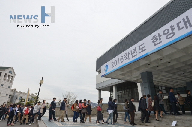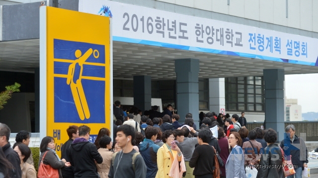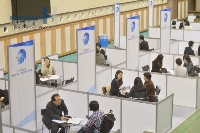 한양대가 4일 서울 성동구 올림픽체육관에서 개최한 2016학년도 입시설명회에는 5000여명의 수험생‧학부모들이 몰렸다. 한양대는 ‘착한 입시설명회’를 기획, 수험생‧학부모들과 1:1의 맞춤형 입시상담에 초점을 맞췄다.