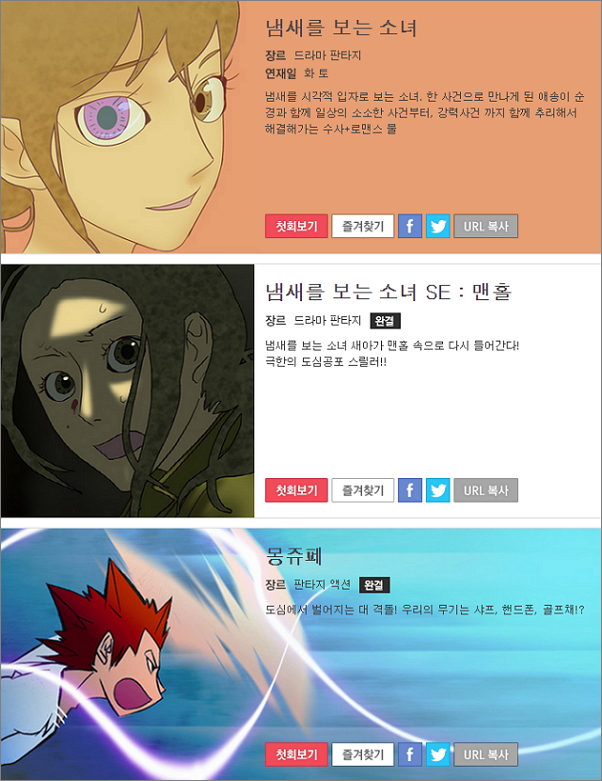 | ▲ 서수경 동문의 <몽쥬페>, <냄새를 보는 소녀>작품. 서 동문은 필명 ‘만취(만화에 취하다)’로 활동 중이다.(이미지출처: 올레마켓웹툰 홈페이지) | ||