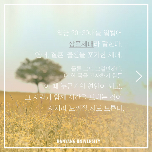 봄입니다. 시험기간이지만 말이죠. 유난히 익명게시물로 '연애 상담'이 많이 올라오는 것도 그 때문일까요? 얼마전 ERICA 캠퍼스에서 15학번 새내기들을 대상으로 진행되었던 '사랑꾼 프로젝트'이 주목 받았고, 그 프로젝트 주최인 학생들을 인터뷰한 기사가 있어 카드뉴스로 전해드립니다. 재학생들은 봄이 청춘들의 것임을 잊지 마시길 바라는 마음으로 준비했습니다.