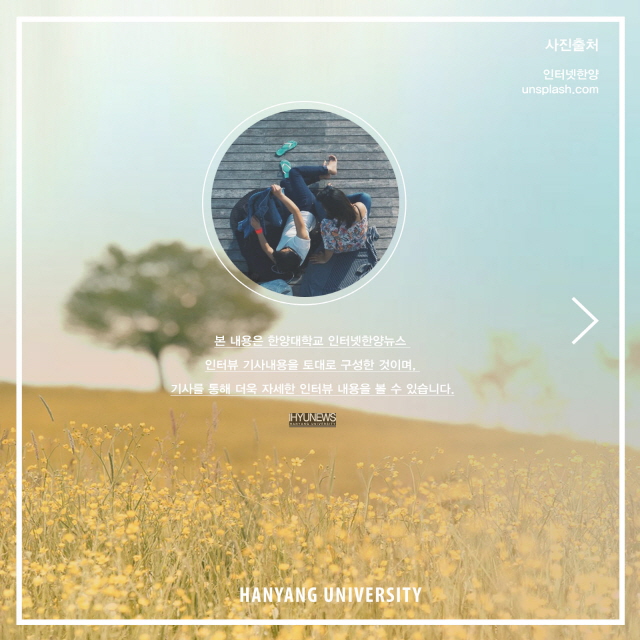 [62. 인터뷰 : 사랑꾼 프로젝트]시험기간에 이런 글, 마음에 안들죠?그래도!! 청춘들의 봄을 위해, 그리고 생각을 실행으로 옮긴 한양인들을 위해 준비해봤습니다 ^^IHNews 인터넷한양뉴스 의 '봄 사랑, 벚꽃 말고' 기사보기 ▶ http://newshyu.com/news/articleView.html?idxno=17142