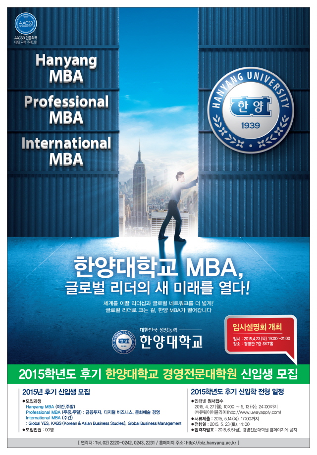 한양대학교 경영전문대학원(MBA)에서 광고를 선보였다. 2015학년도 후기 신입생 모집을 앞두고 관련 모집 안내를 기본 목적으로 제작된 이 광고에는 한양대학교 MBA의 위상을 알 수 있는 이미지 전략을 통해 제작되었다.