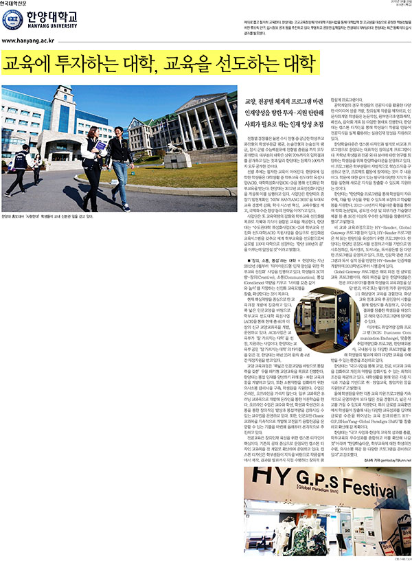 4월 20일자 <한국대학신문>에는 수도권대학 특성화사업(CK-2)과 학부교육 선진화 선도대학(ACE) 지원사업을 중심으로 선진화된 교육시스템을 갖추고 있는 한양대학교에 대한 특집 기사가 실렸습니다. 기사는 한양대가 '다이아몬드형 인재 양성을 위한 학부교육 선진화 사업'의 일환으로 진행하고 있는 교양 교육과정, 전공 교육과정, 그리고 비교과 교육과정인 한양학술타운 프로그램, HY-Reader, Global Gateway 프로그램 등을 소개했는데요. 한양대는 "국고 사업과 한양의 교육적 성과를 총괄, 학부교육의 우수성과를 종합하고 이를 확산해 나갈 것"이라며 "한양학술타운, 학부교육에 대한 학생의견수렴, 의사소통 특강 등 다양한 프로그램을 준비하고 있다"고 전했습니다.