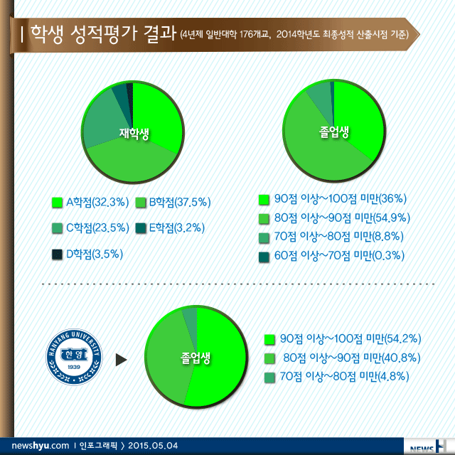 한양대의 경우 2014년 졸업생의 졸업성적 분포는 90점 이상~100점 미만(54.2%), 80점 이상~90점 미만(40.8%), 70점 이상~80점 미만(4.8%)로 나타났으며 60점 이상~70점 미만 및 60점 미만은 0%로 밝혀졌다.(* 2014학년도 최종성적 산출시점 기준)