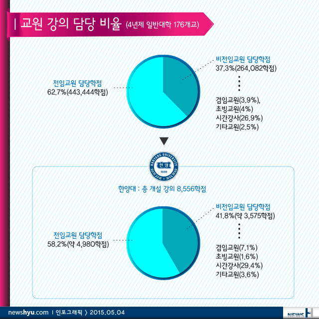 4년제 일반대학 176개교의 교원 강의 담당 비율은 전임교원과 비전임교원으로 구분돼 담당학점을 집계했다. 구체적으로 전임교원 담당학점은 62.7%(443,444학점)의 비중으로 나타났다. 반면 비전임교원 담당학점은 37.3%(264,082학점)를 차지했다. 비전임교원 비율은 겸임교원(3.9%), 초빙교원(4%), 시간강사(26.9%), 기타교원(2.5%)의 담당학점을 합친 수치이다. 동일 항목에서 한양대는 총 개설 강의 8,556학점 중에 전임교원 담당학점은 58.2%(약 4,980학점)로 나타났다. 비전임교원 담당학점은 41.8%(약 3,575학점)으로 밝혀졌다. 이는 겸임교원(7.1%), 초빙교원(1.6%), 시간강사(29.4%), 기타교원(3.6%)이 합쳐진 수치이다.(* 2015학년도 1학기 기준)