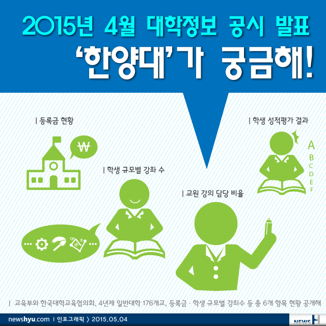 지난 4월 30일 교육부와 한국대학교육협의회는 4년제 일반대학 176개교를 분석해 ‘2015년 4월 대학정보 공시’를 발표했다. 이번 공시를 통해 각 대학의 △등록금 △학생 규모별 강좌수 △교원 강의 담당 비율 △학생 성적평가 결과 △사회봉사역량 △공유재산 등 총 6개 항목에 대한 현황을 알 수 있다. 이러한 내용은 ‘대학알리미(www.academyinfo.go.kr)’에서 확인이 가능하다.