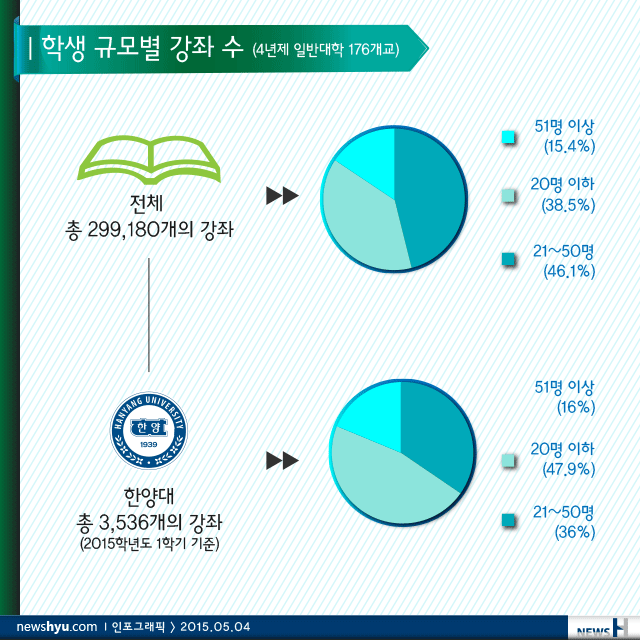 4년제 일반대학 176개교의 학생 규모별 강좌 수는 20명 이하(38.5%), 21~50명(46.1%), 51명 이상(15.4%)으로 총 299,180개의 강좌가 있는 것으로 파악됐다. 이와 비교해 한양대는 20명 이하(47.9%), 21~50명(36%), 51명 이상(16%)으로 총 3,536개의 강좌 수가 마련돼 있다. (* 2015학년도 1학기 기준)