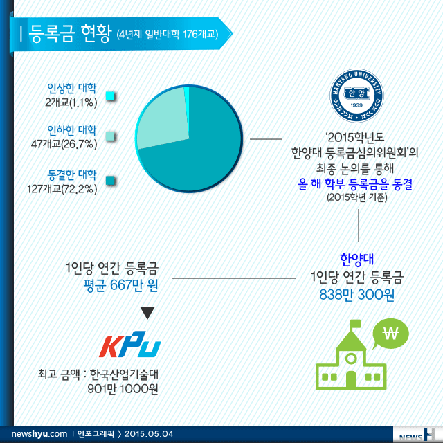 본 공시자료의 2015학년도 대학 등록금 책정 현황을 살펴보면, 4년제 일반대학 176개교 중에서 등록금을 동결한 대학은 127개교(72.2%), 인하한 대학은 47개교(26.7%), 인상한 대학은 2개교(1.1%)인 것으로 나타났다. 1인당 연간 등록금은 평균 667만 원인 것으로 조사됐으며, 최고 금액은 한국산업기술대로 901만 1000원이었다. 한양대의 경우, 공시된 금액은 838만 300원이며 지난 1월 열린 ‘2015학년도 한양대 등록금심의위원회’의 최종 논의를 통해 올해 학부 등록금을 동결한 바 있다. (* 2015학년도 기준)
