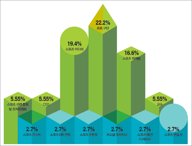 재학생과 교수가 추천하는 스포츠산업학과의 다양한 직업 한양대학교 스포츠산업학과의 대표적인 진로는 3가지로 나뉜다. 스포츠 산업과 연결된 조직으로 진출하는 기업계, 커뮤니티나 의류와 관련된 창업계, 교수나 중·고등학교 선생님으로 이어지는 교육계다. 2015년 4월에 3, 4학년 재학생을 대상으로 실시한 설문조사 결과 인기 있는 분야는 프로 구단 비즈니스와 PD, 기자를 포함한 스포츠 미디어였다.