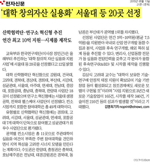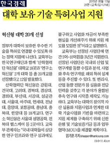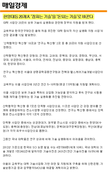 13일자 <매일경제>, <전자신문>, <한국경제>에는 한양대가 교육부와 한국연구재단이 추진한 '대학 창의적 자산 실용화 지원 사업'에 '산학협력단 혁신형' 지원 사업단으로 선정되었다는 소식이 전해졌습니다. 특히 한양대는 사업단 간 강점 분야를 연계해 공동 참여하는 컨소시엄형 사업단(수도권)에도 최우수사업단으로 뽑히게 되었다고 하는데요. 선정된 사업단은 앞으로 연간 5억~10억원을 지원받아 산업 연구개발 동향 수집과 분석, 사업화 후속 연구개발, 해외 특허 설계 등을 추진할 수 있다고 합니다.