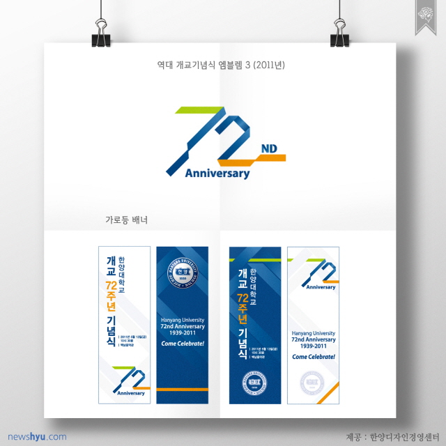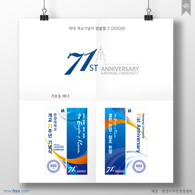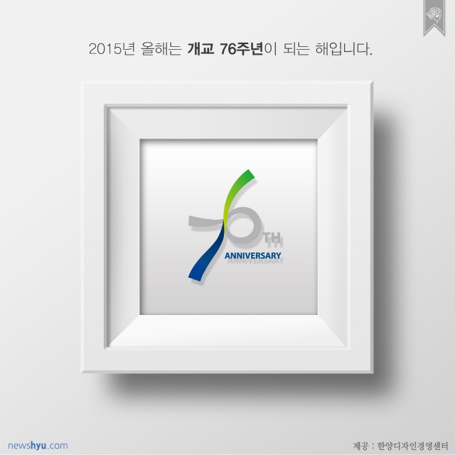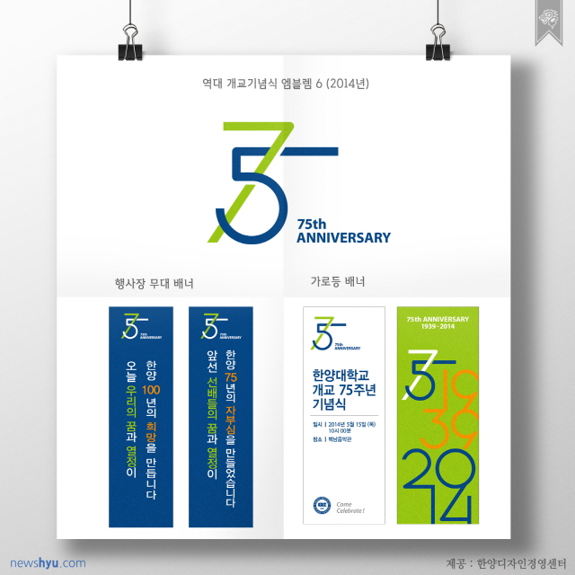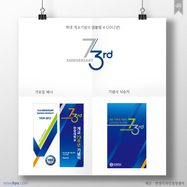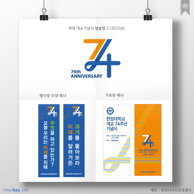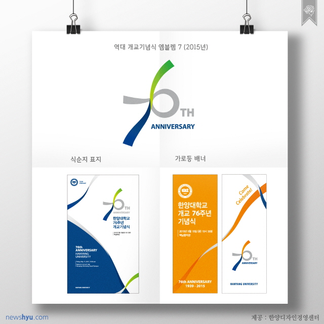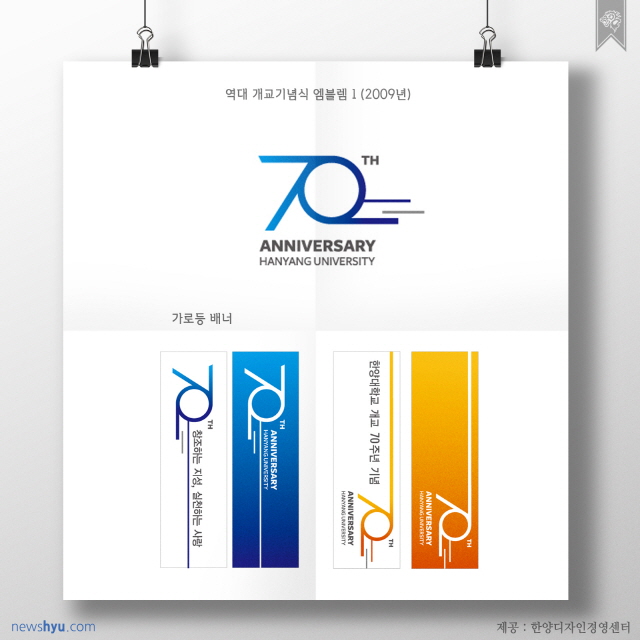학교 기본 UI 이외에도 다양한 조직과 행사에 한양만의 정체성과 특별함을 담은 로고 등이 만들어지고 있습니다. 대부분 대학 행정 부서인 '디자인경영센터'에서 만들어서 사용되고 있는데요. 그 중에 가장 큰 역할을 하는 것이 바로 '개교 기념 엠블럼' 입니다. 지난 2009년 개교 70주년을 맞이하여 대대적으로 행사를 하면서 처음 디자인이 된 이후 7년간 매년 다른 엠블럼을 선보이고 있습니다. 주로 숫자를 활용한 디자인입니다. 70부터 76까지이구요. 과연 어떤 모습들이었고, 그 엠블럼이 활용된 가로등 배너나 식순지는 어떠했는지 구경해 보시죠.