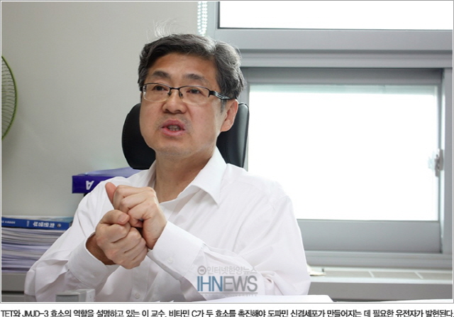 비타민 C의 역할은 바로 억제된 유전자를 깨우는 단계에서부터 시작된다. 이 교수의 이번 논문에서는 중뇌 줄기세포로부터 도파민 신경세포가 분화되는 과정에서 비타민 C가 후생유전학 관련 효소인 TET와 Jmjd3의 활성을 촉진하여, 중뇌 도파민 신경세포 발생, 즉 분화를 유도한다는 사실을 밝혀냈다. 화합물을 떼내는 역할은 TET-1, Jmjd 3라는 두 효소가 담당한다. 비타민 C는 두 효소의 작용을 촉진한다. 잠겨있는 유전자를 푸는 열쇠가 TET-1과 Jmjd 3 효소라면, 비타민 C는 열쇠가 중간에 끼지 않도록 해주는 윤활유 역할을 하는 셈이다. TET-1은 유전자에 붙은 메칠 화합물질을 떼 주는 역할을, Jmjd 3은 유전자를 감싸고 있는 크롬오존이라는 물질을 해제하는 역할을 맡는다. 그 과정에서 비타민 C가 두 효소의 작용을 촉진한다.