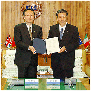 본교는 지난 25일 대표적 국책종합연구기관인 KIST(한국과학기술연구원)와 영어공동강좌에 관한 협약을 체결했다. 이사장실에서 진행된 협정체결식에는 본교 김종량 총장과 KIST 김유승 원장을 비롯해 대학원장 이리형(건축대·건축)교수와 공과대학장 강성군(공과대·신소재)교수 등 본교 교무위원들이 참석한 가운데 진행됐다. 이번 공동영어강의 협정체결을 계기로 본교와 KIST는 상호협력을 통한 국제화 사업의 활성화와 양질의 교육 및 연구환경 조성의 계기를 마련하게 됐다.