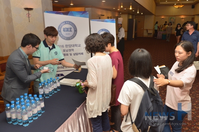 한양대가 31일 전북 전주시 르윈호텔에서 호남권역 수험생과 학부모 500여명을 대상으로 2016학년도 입학설명회를 개최했다. 한양대는 이번 설명회에 20여명의 인재선발관을 투입, 수험생·학부모의 만족도를 높일 수 있도록 일대일 상담에 초점을 맞췄다.