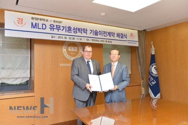 | ▲ 하랄트 보홀테 바스프 부사장(사진 왼쪽)과 이영무 한양대 총장(오른쪽)이 박막 증착기술 독점 라이선스 계약을 체결에 서명했다. | ||