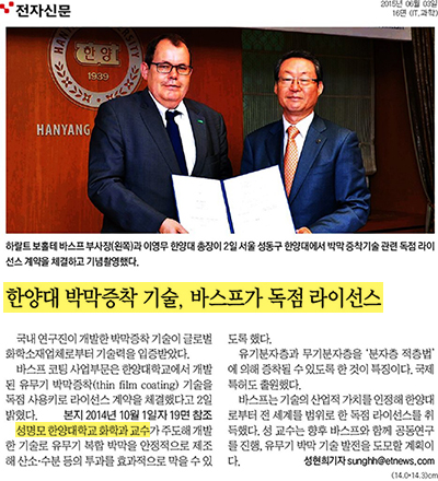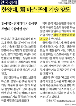 3일자 <매일경제>, <한국경제>, <전자신문>에는 성명모 화학과 교수가 주도해 개발한 '유무기 박막증착 기술'이 독일계 화학회사 바스프로부터 기술력을 입증받았다는 내용이 전해졌습니다. 지난 2일 바스프 코팅 사업부문 전략마케팅·제품개발 부사장과 한양대가 만나 '박막 증착' 기술 독점 라이선스 계약을 체결한 것인데요. 이 기술은 플렉시블 전자기기, 필름형 태양전지에 들어가는 유연 기판을 만드는 데 필요한 핵심 기술이라고 합니다. 이후에도 성 교수 연구진과 바스프는 유무기 박막 기술 공동연구도 진행할 예정이라고 합니다.