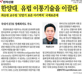 3일자 <전자신문>에는 최승원 융합전자공학부 교수팀이 주도한 '모든 이동통신 표준을 하나의 단말기에서 지원할 수 있는 기술'이 유럽통신표준기구(ETSI) 국제표준으로 결정됐다는 소식이 전해졌습니다. ETSI는 통신기기 관련 제품 유럽 표준기구로, ETSI 표준 충족확인이 없으면 유럽 시장에 제품을 출시할 수 없다고 하는데요. 또한 최승원 교수는 ETSI 분과인 TC-RRS 소규모 분과위원회 의장직을 수행하며 표준정책 시행 공로를 인정받아, 1일부터 열리는 ETSI TC-RRS 정례회의를 서울로 유치했다고 합니다.