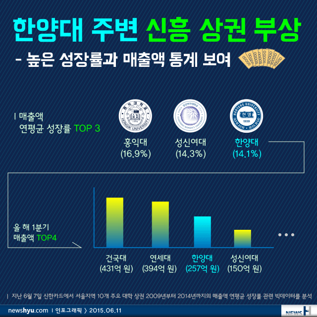 지난 6월 7일 신한카드는 서울지역 10개 주요 대학 상권 2009년부터 2014년까지의 매출액 연평균 성장률 관련 빅데이터를 분석했다. 이 결과에 따르면 한양대는 홍익대(16.9%), 성신여대(14.3%)에 이어 세 번째로 높은 14.1%의 매출액 연평균 성장률을 기록했다.