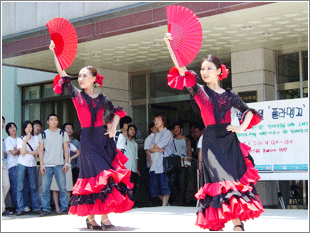 스페인 민속 무용인 플라맹고가 뜨거운 한낮의 햇살을 녹였다. 지난 2일 법과대학 제1법학관 앞마당에서 ‘주리 스페인 무용 꼼빠니아’ 무용단의 플라맹고 초청 공연이 펼쳐졌다. 점심시간을 이용해 펼쳐진 플라맹고의 열정적인 동작 하나 하나는 지나가던 학생들의 눈길을 잡아끌기에 충분했다. 수은주가 30도에 육박할 정도의 무더운 날씨임에도 불구하고, 많은 학생들이 낯선 이국의 춤사위에 매료돼 자리를 뜨지 못했다.