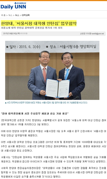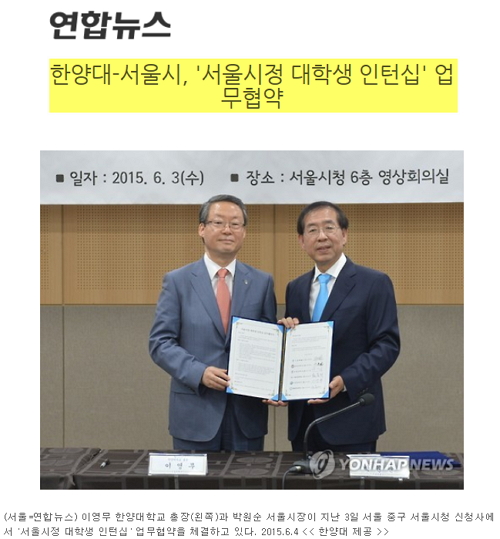 4일자 온라인매체 <연합뉴스>, <한국대학신문>, <뉴스1>, <뉴시스> 등 7개 매체에서는 한양대가 서울특별시가 모집한 '서울소재 대학 대상 인턴십 참여대학' 평가에서 1위를 차지했다는 내용이 전해졌습니다. 이에 따라 지난 3일 이영무 총장과 박원순 서울시장은 '서울시정 대학생 인턴십' 업무 협약을 체결했는데요. 이번 인턴십 프로그램은 2015년 방학 기간 동안 학생들에게 차별화된 실습 기회를 제공하고 학생들의 아이디어가 서울시정에 반영될 수 있는 기회가 될 것이라고 합니다.