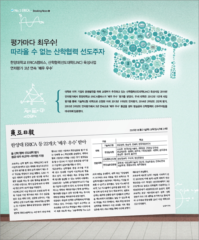 | 대학과 지역 기업의 공생발전을 위해 교육부가 추진하고 있는 산학협력선도대학(LINC) 육성사업 2015년 연차평가에서 한양대학교 ERICA캠퍼스가 ‘매우 우수’ 평가를 받았다. 우리 대학은 2012년 1단계 사업평가를 통해 기술혁신형 대학으로 선정된 이래 2013년 1차년도 연차평가, 2014년 2차년도 2단계 평가, 2015년 3차년도 연차평가에서 3년 연속으로 ‘매우 우수’ 등급을 받아 명실공히 산학협력의 선두주자임을 대내외에 입증했다. |