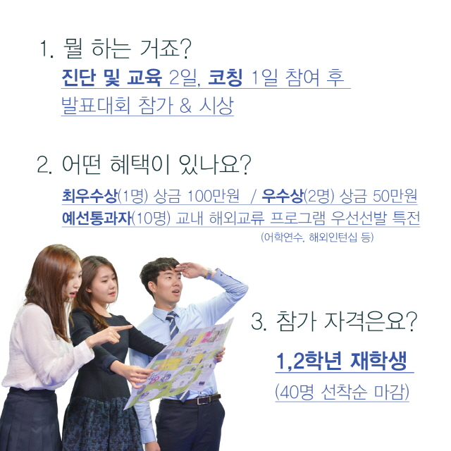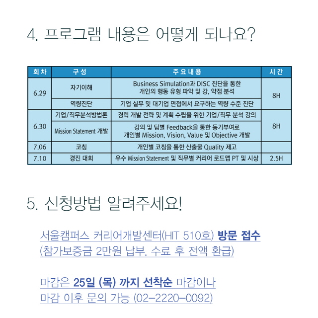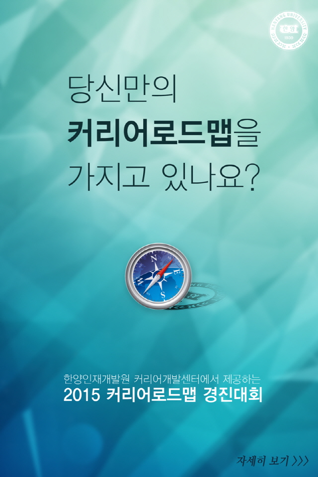 아직 취업 걱정을 하기에는 이를 수 있는 대학 1,2학년. 하지만 멀리 보고 방향을 잡아야 하는 시기인 것은 분명하겠죠. 이런 저학년들을 위한 커리어 로드맵 작성 지원 프로그램이 방학을 맞이해 가동이 되었습니다. 많은 시간을 투자해야하는건 아니지만 꼼꼼하게 도와줄 든든한 지원을 받는 건 꽤 괜찮아 보이는데요. 즐거움도 더 커지라고 경진대회 형식으로 참여하는 재미를 더해주고 있네요. 한양인재개발원 커리어개발센터에서 준비한 <2015 커리어로드맵 경진대회>를 소개합니다.