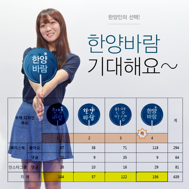 4개의 후보를 놓고 '일요퀴즈'로 진행되었던 부채 디자인의 최종 결과가 나왔습니다. 글쎄체의 모양에 따라 느낌이 달랐던 만큼 작은 차이지만 사람들의 선호도에 맞춰 의견이 달라졌었습니다. 결과는 4번 후보. 고딕체로 단정하게 써진 글씨에 사람들이 가장 많은 '좋아요'를 눌러주셨네요. 실제로 제작하면 어떤 모습일지 기대가 됩니다~