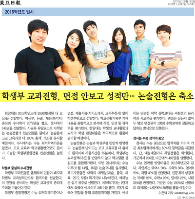 마지막으로는 2016학년도 한양대 입시 정보에 대한 내용이 소개되었습니다. 먼저, 학생부 교과전형은 올해부터 면접이 폐지되어 교과성적만으로 선발하게 되는데요. 학생부 종합전형은 수능 최저학력기준과 면접, 자기소개서 등의 제출서류도 없이 교내활동과 교사의 관찰 내용을 가지고 선발한다고 합니다. 또한 논술전형은 논술과 학생부가 반반씩 반영되며 고교 교육과정 내에서 출제될 예정이라고 합니다.