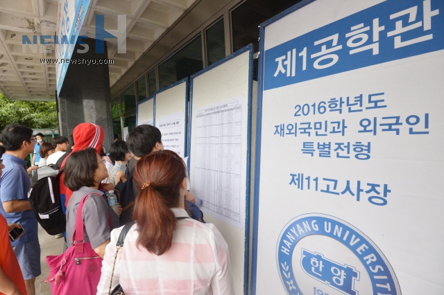 | ▲ 고3 수험생과 학부모들이 한양대 제1공학관에 마련된 2016학년도 재외국민·외국인 특별전형 고사장에서 수험번호와 고사실을 확인하고 있다. | ||