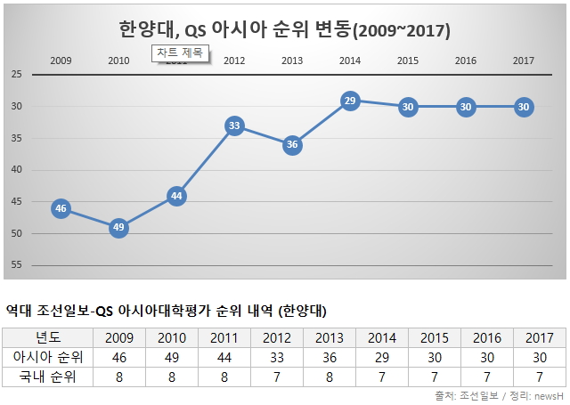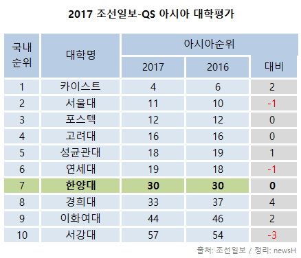 조선일보·QS는 ‘2017 아시아 대학 평가’에서 10가지 지표로 아시아 17개국 426개 대학을 평가했다. 10개 평가 지표는 ▲학계 평가(30%) ▲졸업생 평판도(20%) ▲교원당 학생 수(15%) ▲교원당 논문 수(10%) ▲논문당 피인용 수(10%) ▲박사 학위 소지 교원 비율(5%) ▲외국인 교원 비율(2.5%) ▲외국인 학생 비율(2.5%) ▲해외로 나간 교환학생(2.5%) ▲국내에 들어온 교환학생(2.5%)이다.