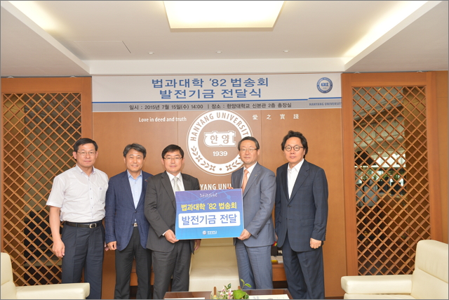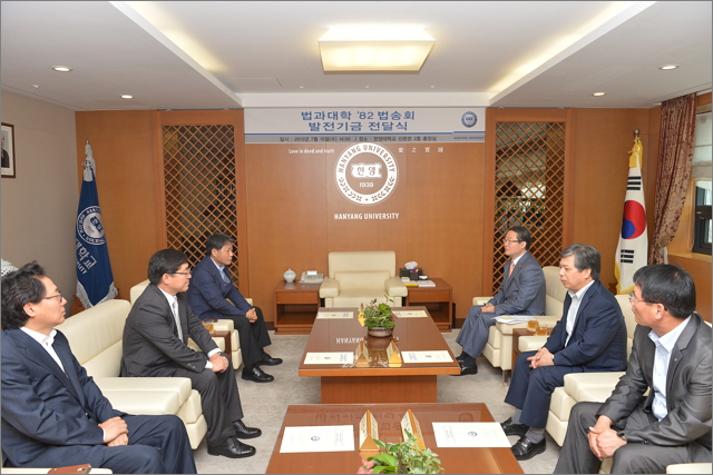 지난 7월 15일 한양대 신본관 2층 총장실에서 82학번 법대 고시반 모임인 ‘법송회’의 발전기금 전달식이 열렸다. 이번 전달식은 총 5천만 원의 발전기금 약정을 진행했으며, 이는 매년 1천만 원씩 5년 동안 기부될 예정이다. 이날은 1차 전달식으로 1천만 원이 기부됐다.