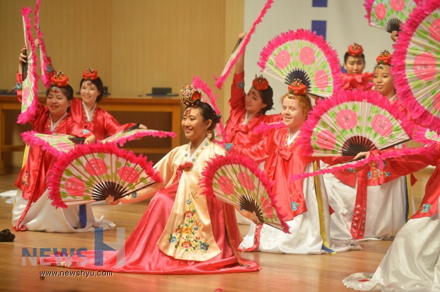 | ▲ 국제여름학교 부채춤 수업에 참여한 학생들이 부채춤 공연을 하는 모습 | ||