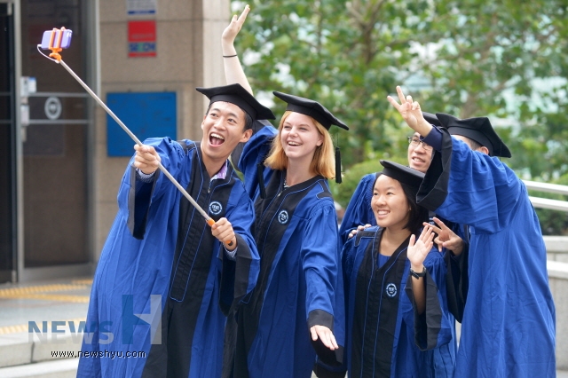 | ▲ 국제여름학교에 참가한 학생들이 졸업식을 마친 후 셀카봉을 이용해 촬영을 하는 모습 | ||