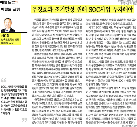7월 31일자 <헤럴드경제>에는 서영찬 교통·물류공학과 교수가 SOC사업에 대한 기고글을 전했습니다. 서 교수는 "금번 추경 편성에 사회간접자본(SOC)에 대한 투자를 확대할 필요가 있다"면서 "SOC 사업이 일자리 창출과 경기활성화 측면에서 효과가 크다는 것은 이미 검증된 사실이다"고 말했는데요. 그는 이어 "SOC 사업이 위기탈출을 위한 만병통치약은 아니지만, 좋은 처방임은 분명하다. 이번 추경 편성이 내수 위축으로 서민층에 집중되고 잇는 사회적 고통을 조금이나마 덜어줄 수 있을 것으로 기대한다"고 말했습니다.