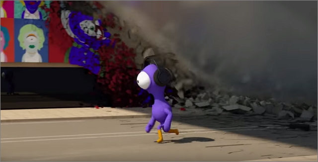 | ▲ 택배기사가 배송을 위해 작은 행성에 방문하면서 행성은 건물이 붕괴되는 등 멸망의 위기에 처한다.(이미지출처: ‘자니 익스프레스’ 유투브 동영상) | ||