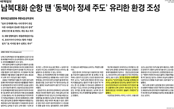 27일자 <세계일보>에는 이번 8·25 남북 합의를 통해 한국 외교에 어떤 변화가 생겼는지에 대한 기사가 게재되었습니다. 기사는 이번 합의가 동북아평화협력구상이나 한반도신뢰프로세스, 유라시아이니셔티브를 다시 추진하는 계기가 될 수도 있다고 전했는데요. 엄구호 러시아학과 교수는 "군사적 충돌 가능성을 크게 봤던 러시아는 남북 합의로 안도하는 분위기"라며 "유라시아친선특급이 러시아에서 아주 반응이 좋은 상황에서 남북 관계가 개선되면 남·북·러 협력사업으로 이어지지 않을까 기대한다"고 말했습니다.