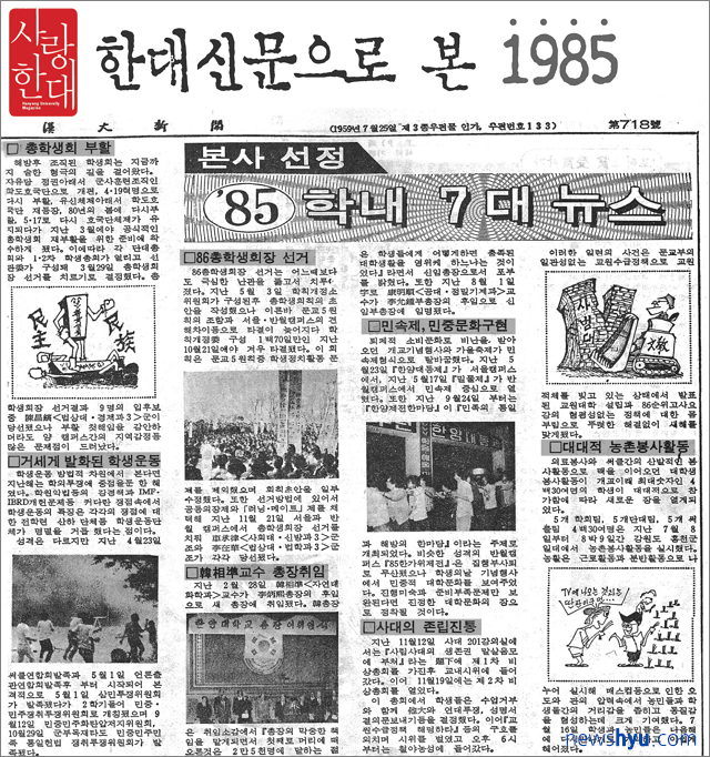 85학번 추억은 민주화 운동의 역사와 함께 합니다. 해방 후 조직된 총학생회는 4·19혁명, 5·17 쿠데타 등 숱한 형국을 거치며 개편되다가 마침내 1985년 3월에 재부활했고, 86 총학생회장 선거는 시대적 난관을 뚫고 170일 동안 치러졌습니다. 또한 당시 퇴폐적 소비 문화로 비난을 받던 개교기념 행사와 가을 축제가 민속제 형식으로 탈바꿈되어 구현되는 등 85학번은 시대의 격변기 속에서 대학 시절을 보냈습니다.