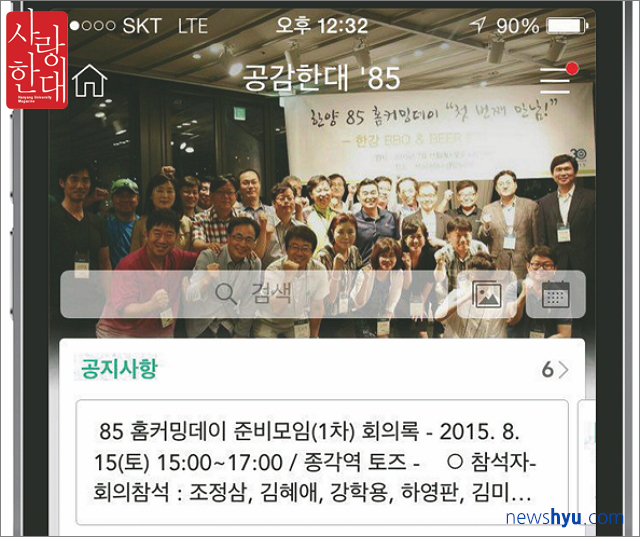 8월 20일 기준으로, 공감한대 85 밴드 가입자는 총 500명입니다. 한양대학교 대외협력처가 지난 6월에 밴드를 개시한 후 85학번 동문 사이에서 입소문과 초대가 연일 이어져 가입자 수가 놀라운 속도로 증가하고 있습니다. 동문들이 밴드에 올리는 콘텐츠는 기분 좋은 아침 인사부터 맛집이나 여행, 생활, 경제에 대한 정보, 소소한 일상 이야기 등 시시콜콜 다양합니다. 이번 홈커밍데이 주제인 ‘공감한대’도 밴드 투표로 정해진 만큼 이곳은 현재 85학번의 메카입니다. 공감한대85 밴드는 홈커밍데이가 끝나도 계속 이어질 예정이니 아직 밴드에 가입하지 않은 동문이라면 어서 가입하세요!