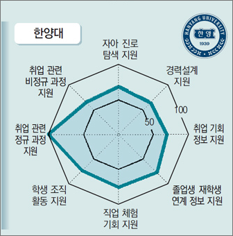 항목별 평가를 보면 한양대는 취업관련 정규 과정 지원 항목에서 100점 만점을 받아서 가장 높은 점수를 받은 항목으로 부각됐다. 전년도 이 항목은 50점에 가까운 가장 낮은 점수를 받은 항목이었다. 나머지 7개 항목에서도 골고루 안정된 점수를 받아서 종합적인 운영이 잘 되고 있다고 분석 된다.