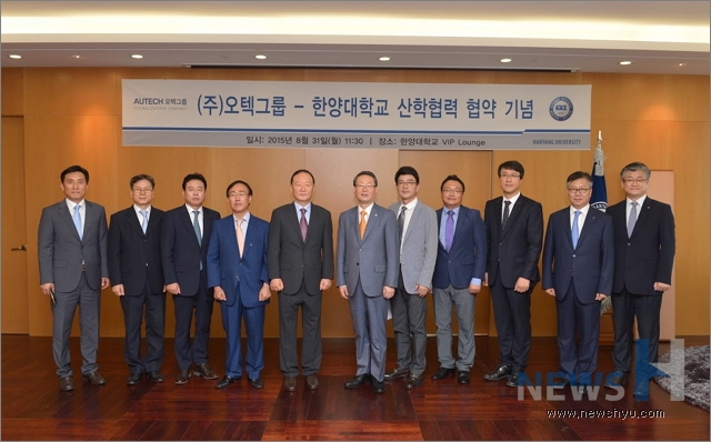 지난 8월 31일이 오전 11시 30분 한양대학교 신본관 2층 총장실에서 한양대학교 - (주)오텍그룹 산학협력 협약식이 열렸다. 이날 협약식은 한양대 이영무 총장을 비롯해 (주)오텍그룹 강성희 회장, 차배언 사장, 정필경 부사장 등 주요인사 12명이 참석한 가운데 이뤄졌다.