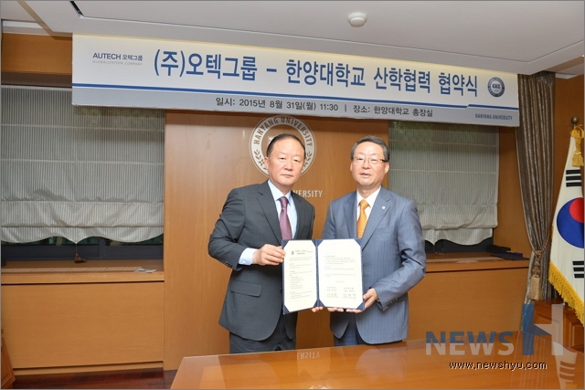 | ▲ 한양대-(주)오텍그룹 산학협력 협약식. 한양대 이영무 총장(사진 오른쪽), 오텍그룹 강성희 회장(사진 왼쪽)(사학ㆍ75) | ||