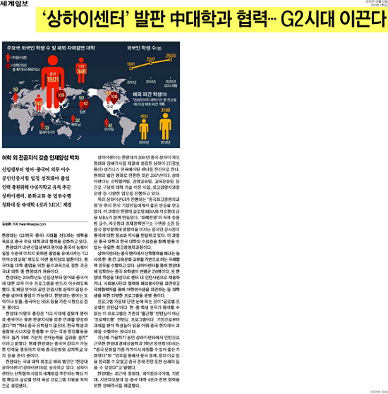 첫 번째 기사에는 한양대가 G2 시대를 선도하는 대학으로 거듭나기 위해 해외 대학과의 협력을 강화하고 있다는 내용이 전해졌습니다. 한양대는 또한 내년 신입생부터 영어와 중국어를 졸업을 위한 필수과목으로 정하는 'G2언어소양교육' 제도도 도입할 예정인데요. 국내 대학 최초로 해외 법인인 '한양대 상하이센터'도 보유하고 있어 산학협력의 세계화와 글로벌 인재 육성에 힘을 쏟고 있습니다.