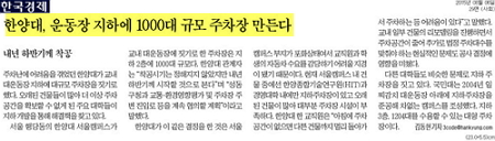 8월 6일자 <한국경제>에는 한양대가 교내 대운동장 지하에 대규모 주차장을 건설할 예정이라는 내용이 전해졌습니다. 캠퍼스 부지에 더이상 주차할 공간이 없자 이를 해결하기 위해 지하 2층에 1000대 규모의 주차장을 건설하기로 한 것인데요. 한양대 관계자는 "착공시기는 정해지지 않았지만 내년 하반기께 시작할 것으로 본다"고 말했습니다.